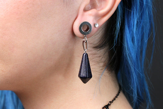 Blue Goldstone Pendulum Stainless Steel Danglers - Screw on Tunnel (Pair) - TF010