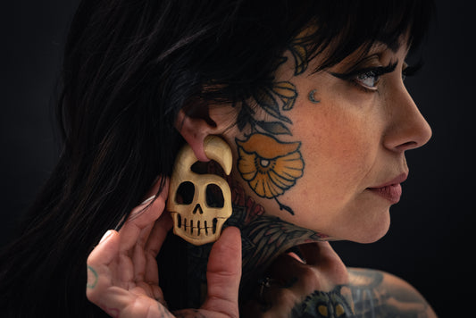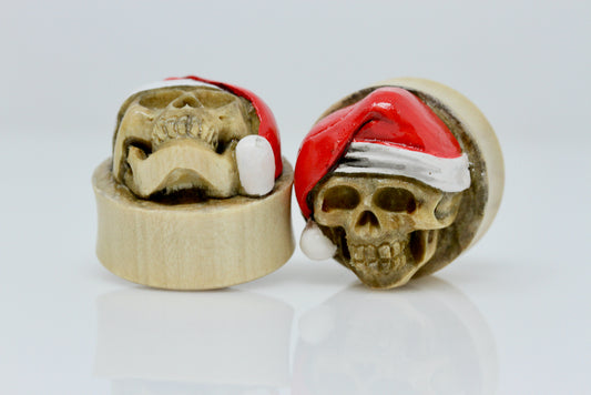 Santa Skull Wood Plugs - Hand-Carved Plugs (Pair) - PA162