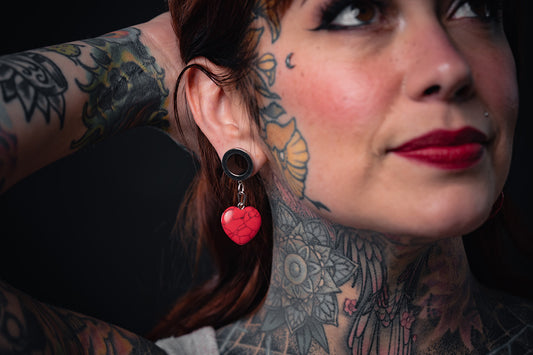 Red Howlite Heart Danglers - Screw on Tunnel (Pair) - TF087