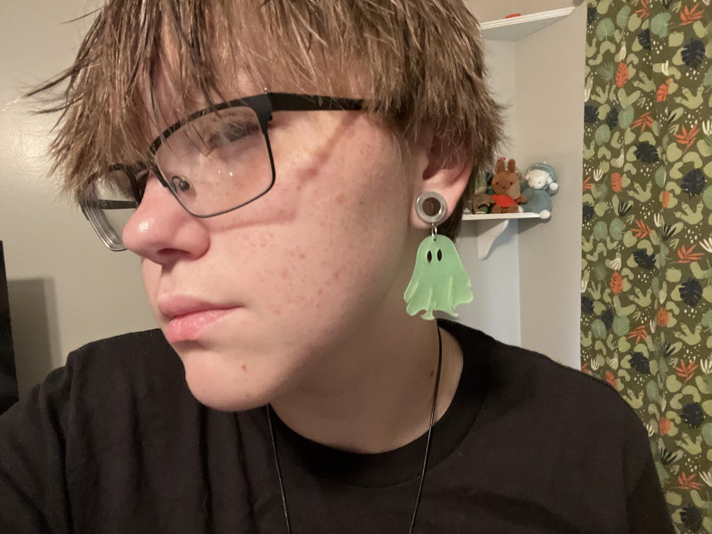 This shy little ghost glows in the dark and is a perfect dangler for the Halloween season. These ghosts are stainless steel screw-on tunnels with acrylic ghost danglers. These shy little ghosts are the perfect spooky season highlight. They are currently available in these sizes.