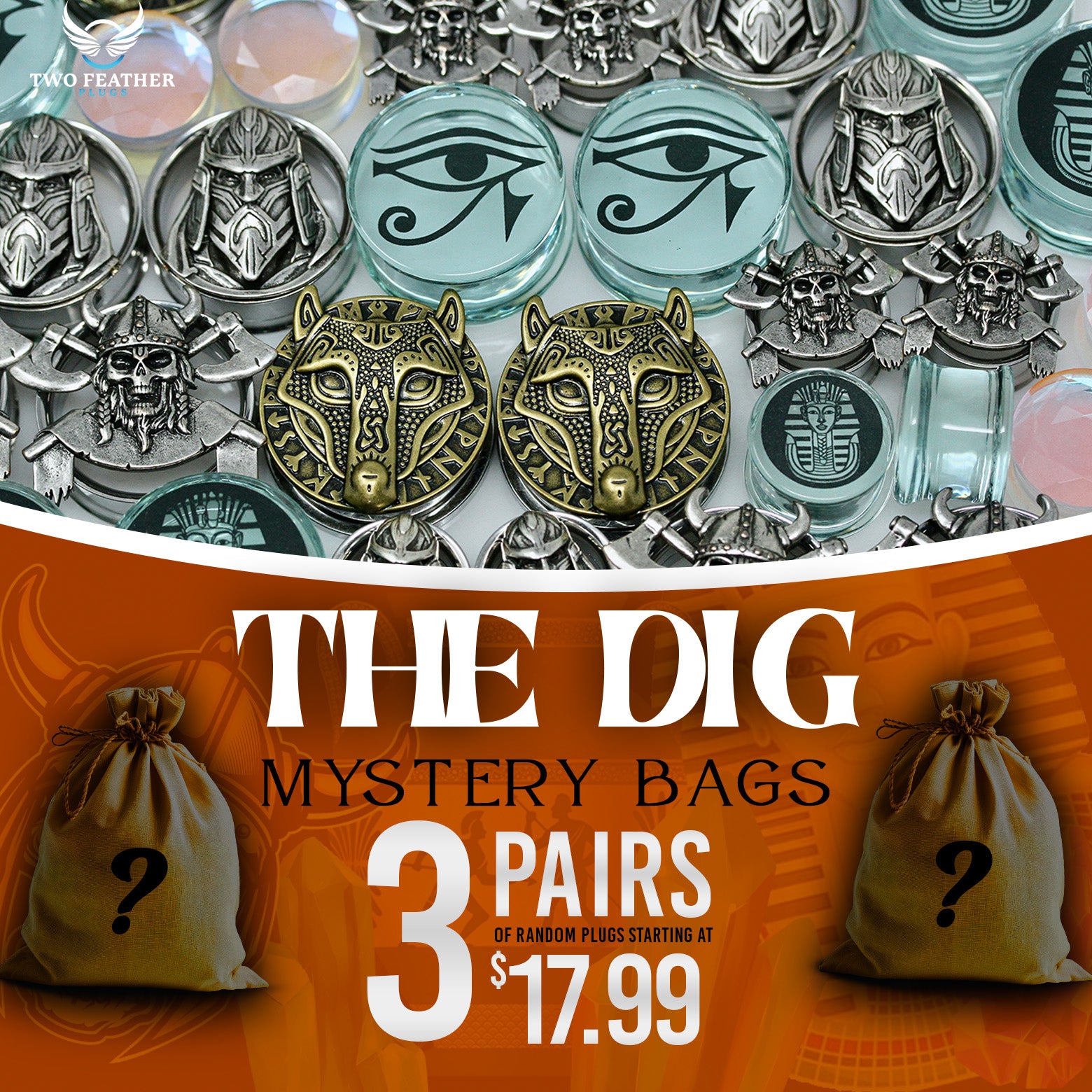 We have discovered treasures for your Stretched Ears. Egyptian, Viking artifacts, and Gems. And you will get them at a discount. You will get 3 pairs of simple plugs and tunnels. We have only a few of these bags made.