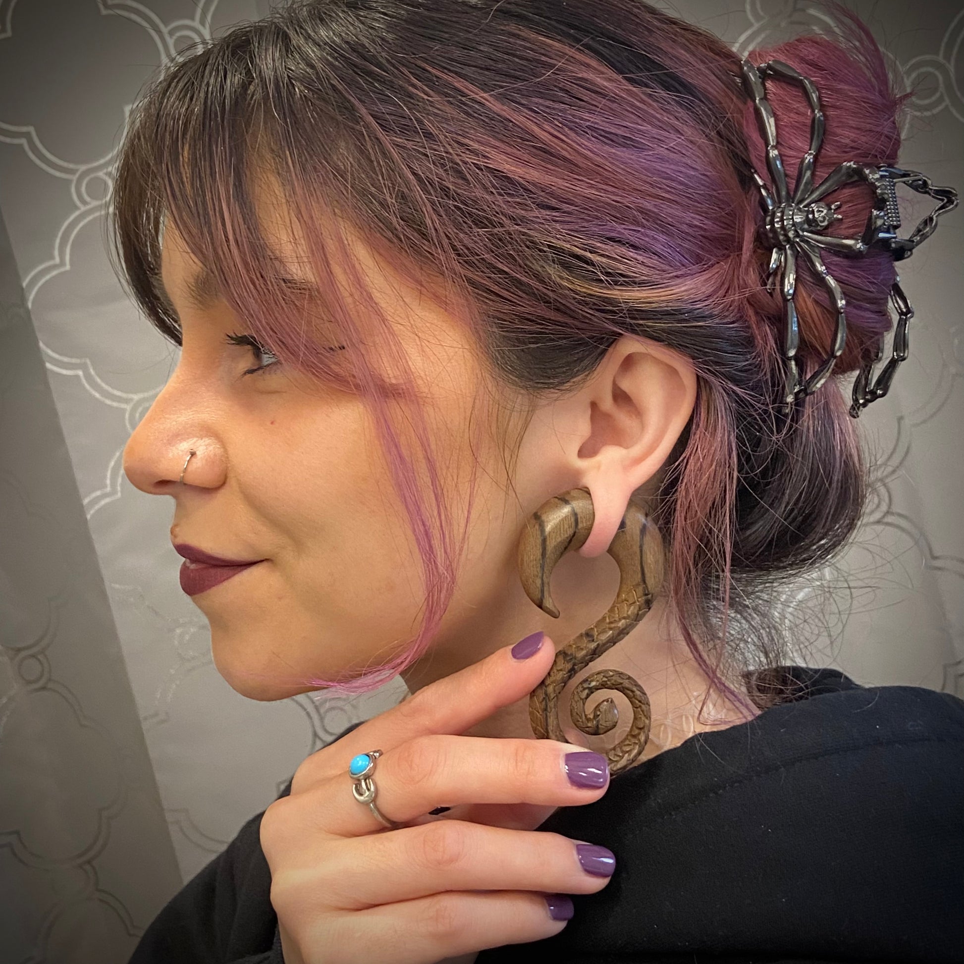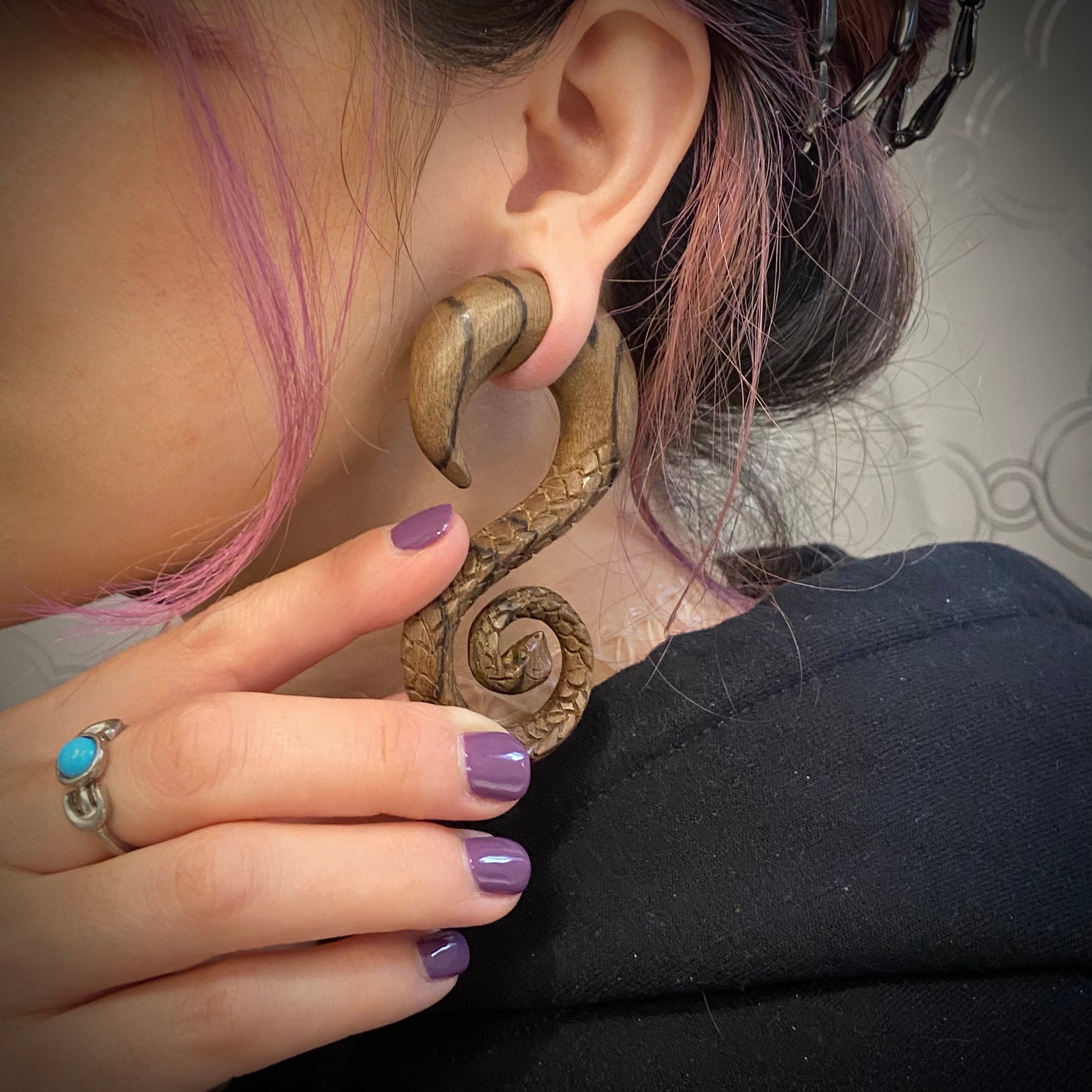 Calling all reptile lovers, this design of hanger plugs showcases a beautifully carved snake. We have this design in other materials as well for other color options. This pair of Serpent Plug Earrings is handcrafted from areng wood.  This snake is available in the sizes following dimensions...