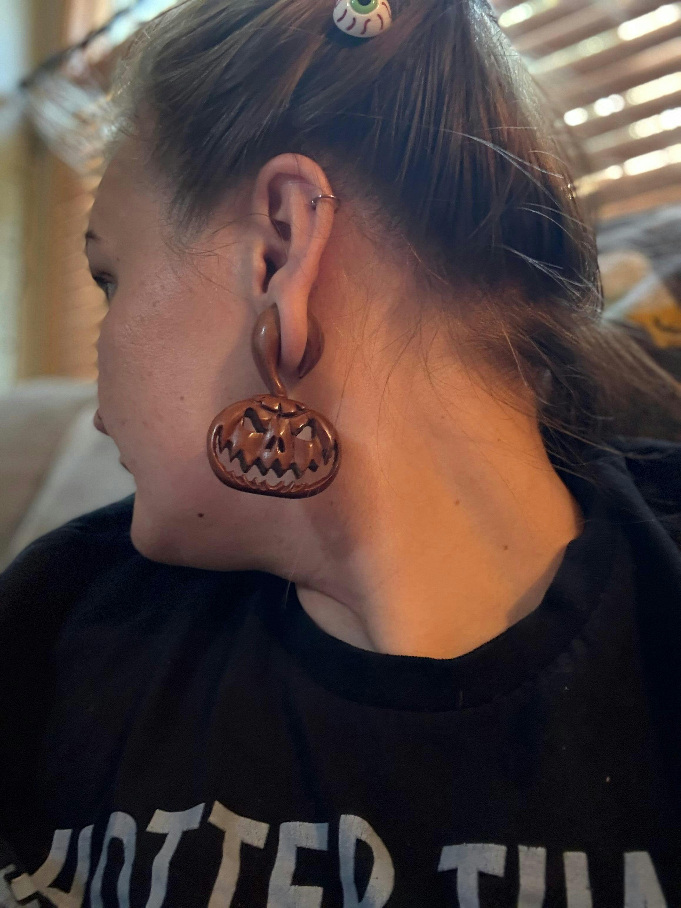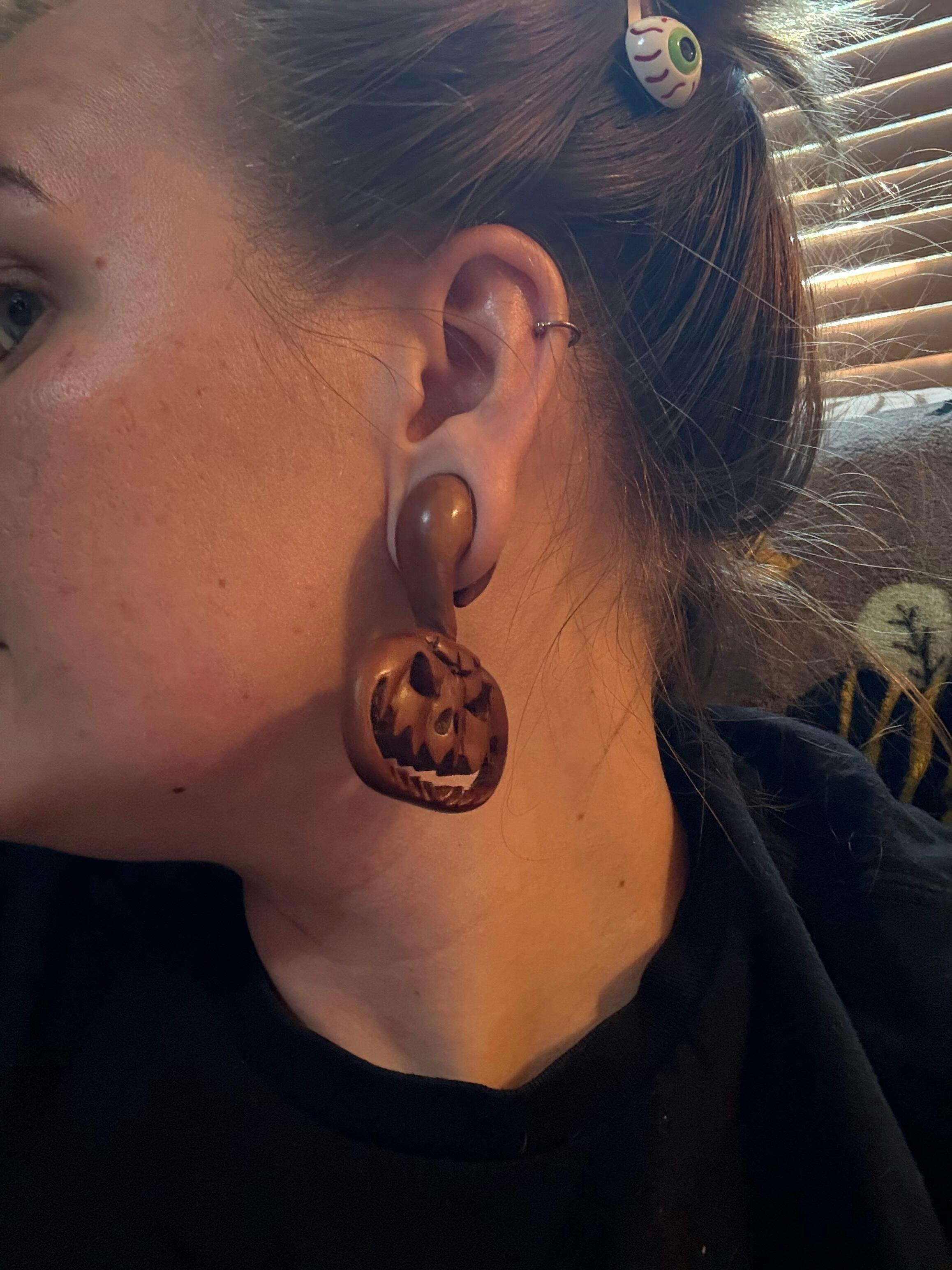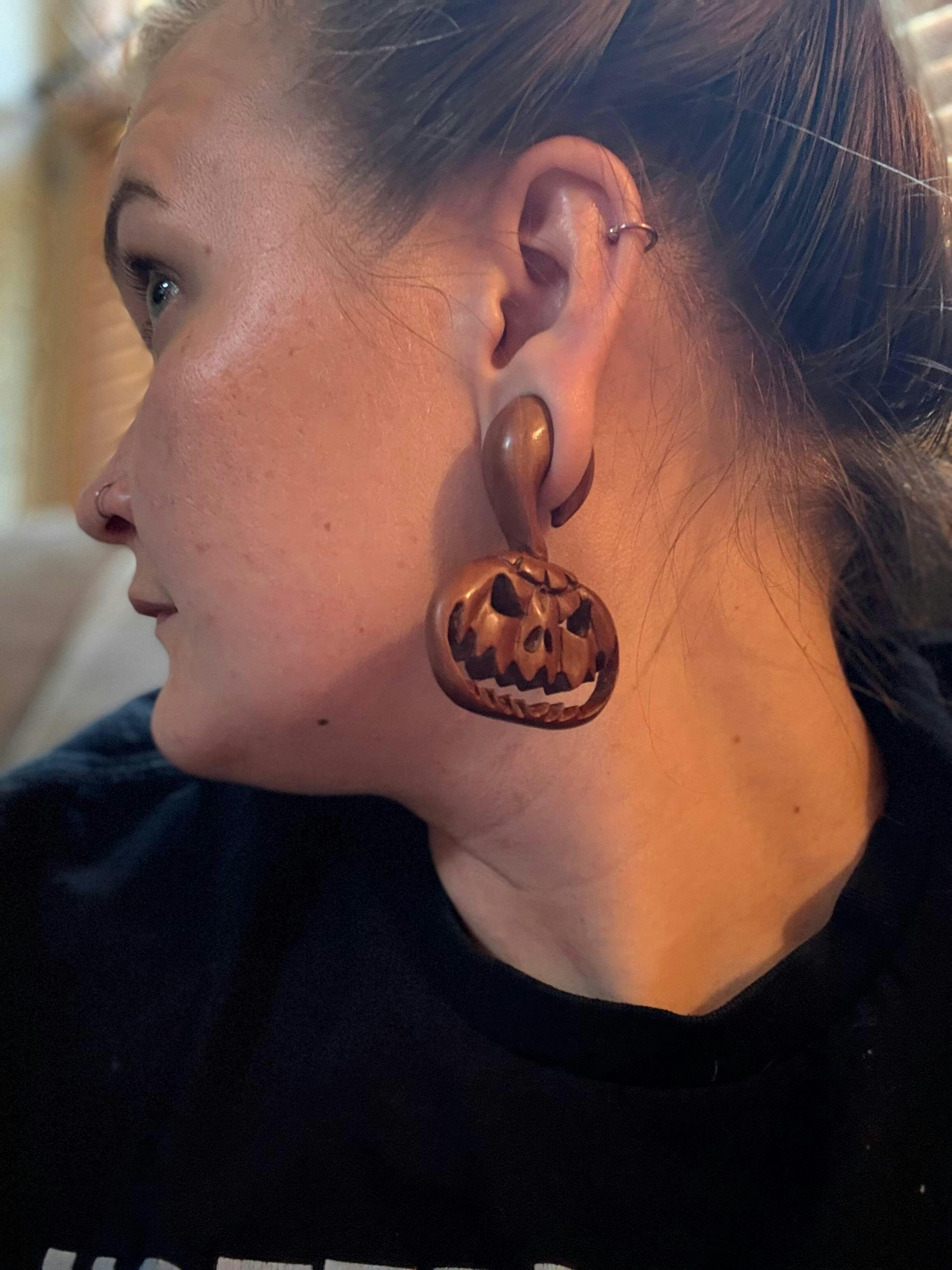 These hand-carved pumpkins are perfect for this Halloween season. An evil Jack-O-Lantern hangs from your stretched ears, ready for the nights to come. If hangers aren't your style, we also have several pumpkin plug designs as well. These hangers are carved from sawo wood and available in 3mm - 25mm.
