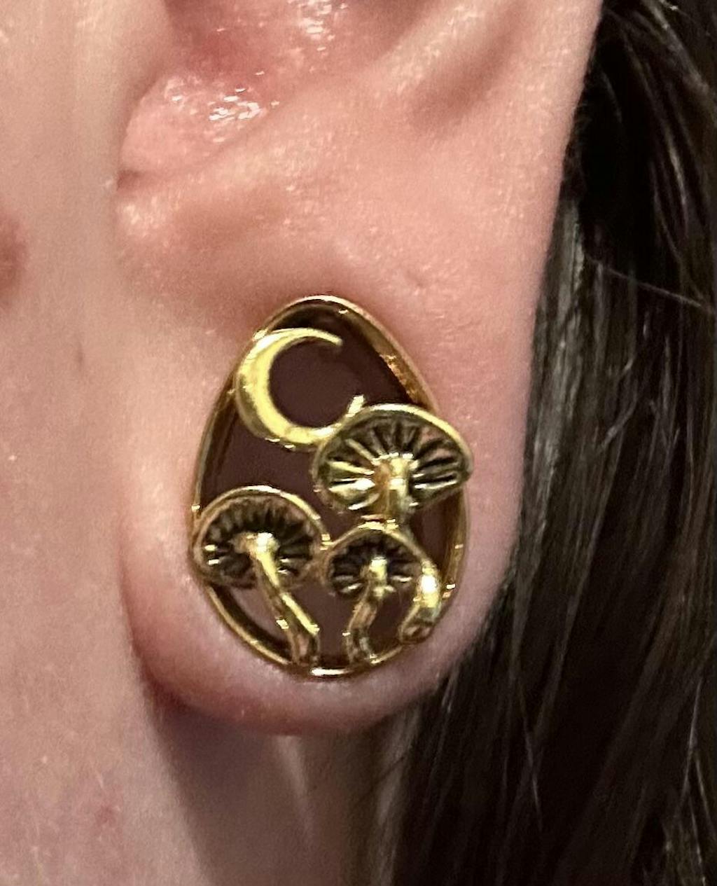 The Golden Mushrooms Teardrop Tunnels are double flared and measure to fit in your ears.  This tunnel is gold and made of stainless steel.  These mushrooms are a trippy look for your stretched ears  They are currently available in these sizes.