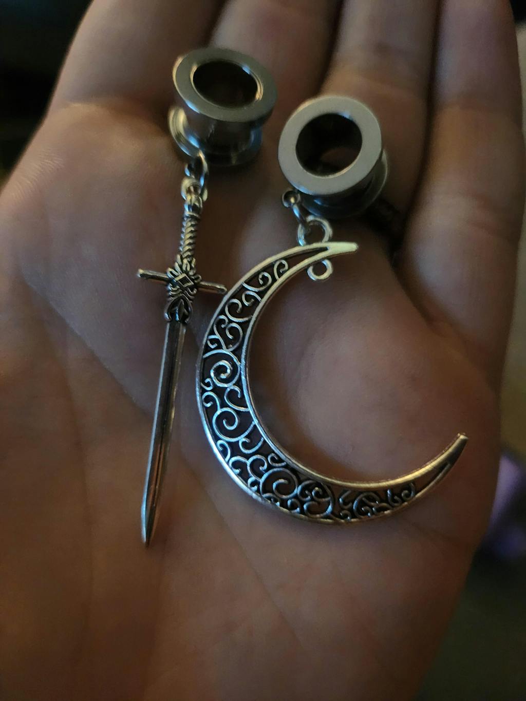 Add these Moon and Sword Danglers to your collection of plugs  The tunnels are made of stainless steel with a screw-on back.
